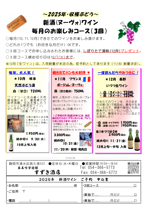 新酒ワイン2025:10月天然葡萄酒(白) / 11月ボージョレヌーボ(赤) / 12月いづつ生ワイン(白)(赤)